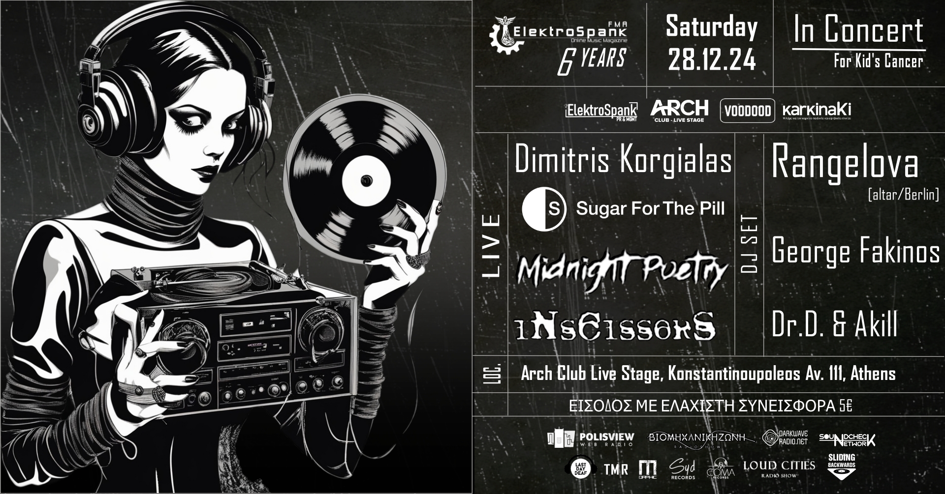 Το μεγαλύτερο ελληνικό ηλεκτρονικό περιοδικό για την dark alternative σκηνή γιορτάζει την 6η επέτειο του με ένα ακόμα τεράστιο event το οποίο έρχεται μετά την τεράστια επιτυχία των προηγούμενων ετών. Έχοντας ακόμα μεγαλύτερη όρεξη και υποστήριξη το ElektroSpank In Concert 2024 συνεχίζει τη συνεργασία με το The Arch Club Live Stage, με ένα event που θα ξεκινήσει με live shows που καλύπτουν ένα ευρύ φάσμα της σκοτεινής μουσικής αλλά και με dj sets από κορυφαίους DJs της σκηνής.